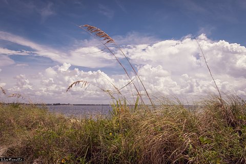 Sunny afternoon at the beach. The dunes are covered with flowers, weeds and long seagrass dancing in the wind. This was at Tarpon Springs Beach in Florida.