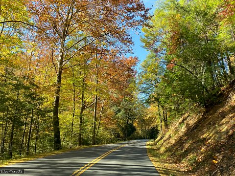Autumn in the Smoky Mountains is a special treat. Blue skies and colorful leaves with soft yellow light and shadows on the ground. This was somewhere on Hwy 28, coming from Franklin, NC going towards Tennessee.
