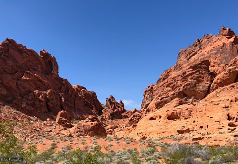 These rocks reaching into the blue sky really suit the name of Valley of Fire which is 45 minutes North of Las Vegas, Nevada. On the left side is a road where a car is coming down the hill between the amazing red rocks.