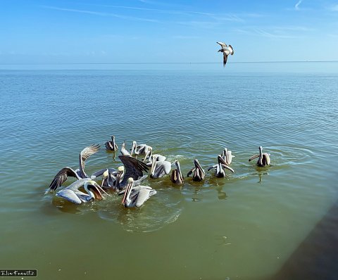 Pelican Feeding Time. The seagull is waiting for her turn.