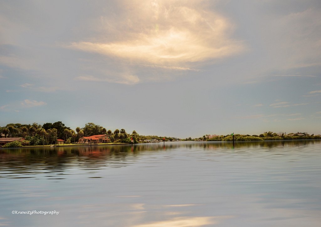 This photo is taken against the sun from the bridge in Aripeka, with a view of the Gulf of Mexico in the distance and a bright ref…