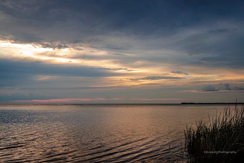 The sun has just set and the last rays of sun lighten up the clouds, reflecting in the water.