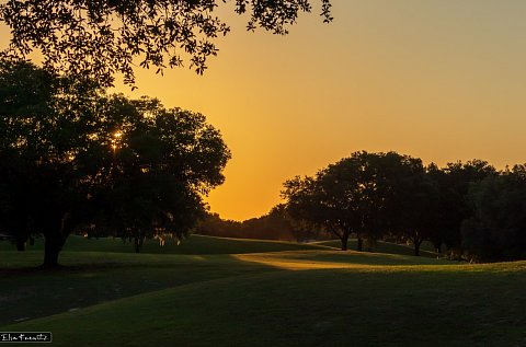 Golden light is streaming through the trees and onto the lawn. This is a sunset without any clouds and still it is very colorful and serene.