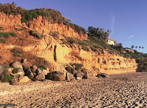 The full light of the setting sun hits the red cliffs of the Pacific Ocean in Encinitas, California.