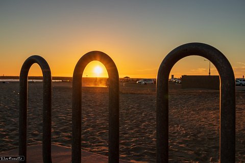 The sun shining through the bike stand attracted my attention. The rays curl directly around it. In the distance some people made a little fire. The beach is amazingly empty and the Pacific is calm. What a wonderful evening!