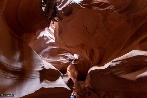 In front are some visitors at the Antelope Canyon in Arizona, demonstrating how high and narrow this canyon is. Above me hangs a large branch between the rocks with some dirt on top. The colors of the rocks are really beautiful and hard to capture as it's quite dark where there is no sun light coming in.
