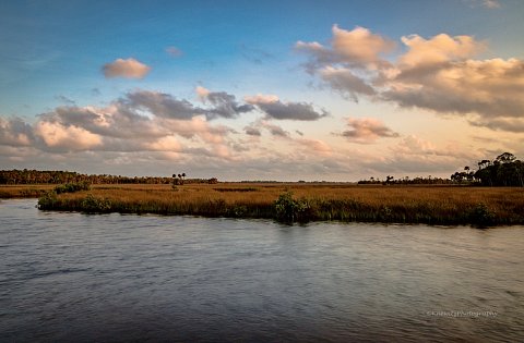 Late afternoon at the Jenkins Creek with gorgeous sunny clouds hanging over the wetlands of Florida.