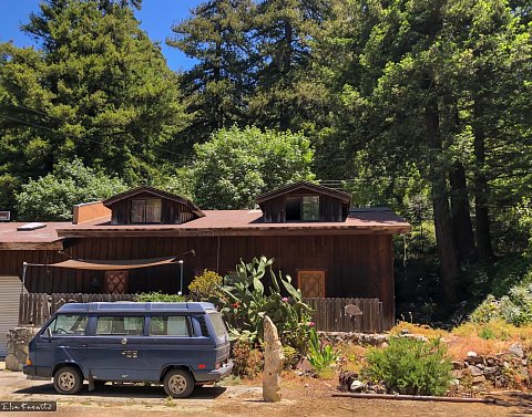 It's the time of the year when the morning hours at the Pacific Ocean are often hazy or even covered with deep fog. Usually it clears up later during the day. This is at Hwy 1, there is a car in the distance and some kind of building on top of the mountain, the air is cool and damp.